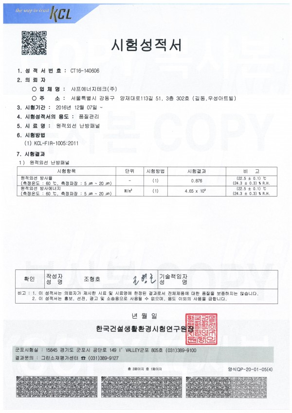 [저온,고온용 복사 난방패널] 시험성적서_60도 원적외선 방사율